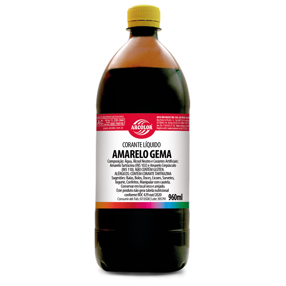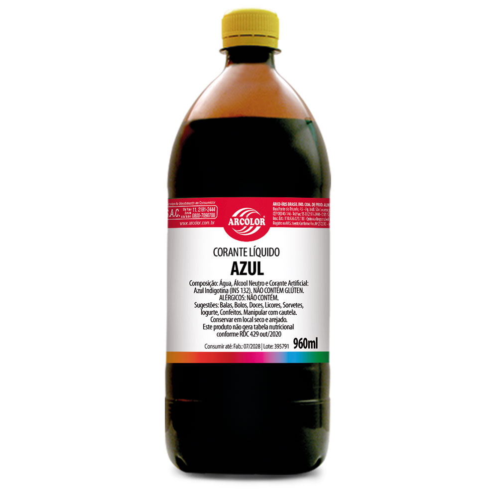 O Corante Líquido Arcólor não gera informações nutricionais, por não conter quantidades significativas de valor energético, carboidratos, proteínas, gorduras totais, gorduras saturadas, gorduras trans., fibra alimentar e sódio.